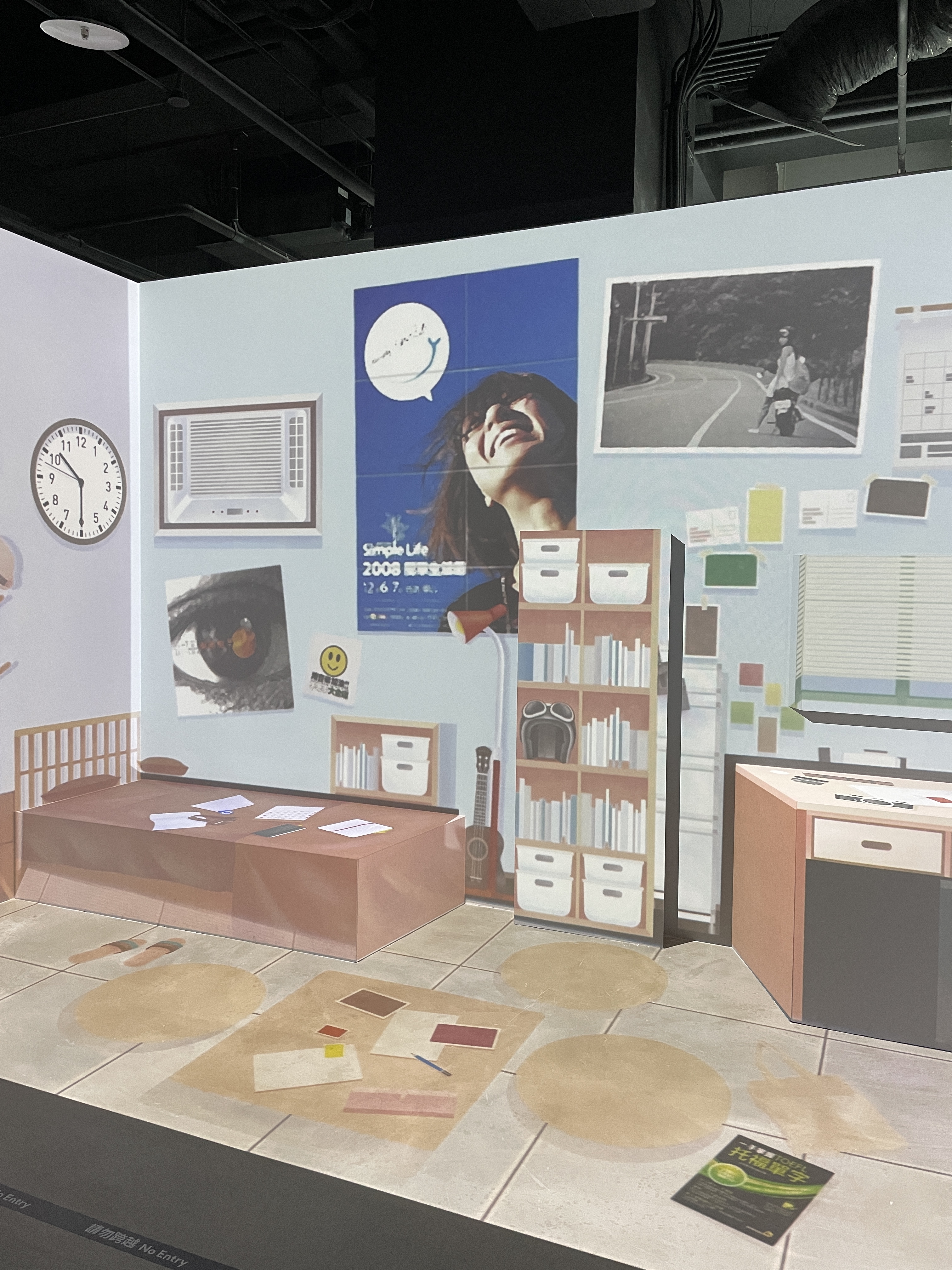 而從「年輕人的精神世界」展區開始,便是讓我極有感的內容 —— 由陳綺貞唸導讀再適合不過。這區的影像與音樂完美結合,用投影呈現出不同年代小房間的佈置,從 1980 年代的李宗盛、蔡藍欽、1990 年代的張雨生、2000 年代的周杰倫、五月天、宋岳庭,2005 年代的陳綺貞、簡單音樂節,再到現代的草東沒有派對、滅火器、大港開唱…,房間牆壁都掛著符合時代的海報與旗幟,反映出年輕人的喜好與流行趨勢,而各時代的歌曲也唱出年輕人的挫折、對社會的失望、與對未來的期待。