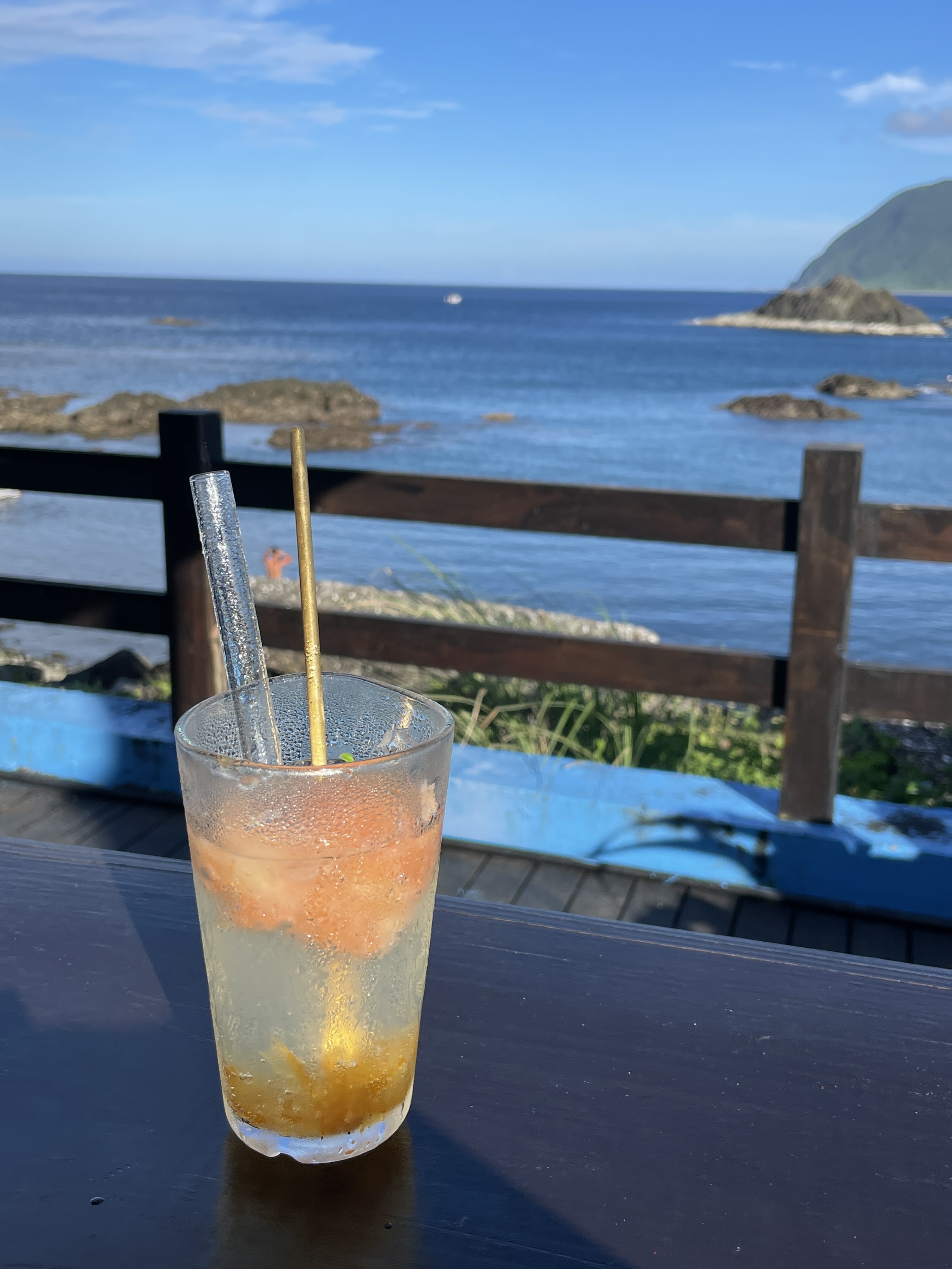 騎到東清大約是下午四點,我們肚子有點餓,便決定在 Google 地圖上評價極佳的東清三十三號吃下午茶。我與旅伴特地選了戶外面海的座位,決定邊吹海風、邊享用美味的餐點。最後點了炸飛魚、巧克力起司蛋糕、芋頭奶奶、蜂蜜雙柚氣泡飲與莓果氣泡飲。