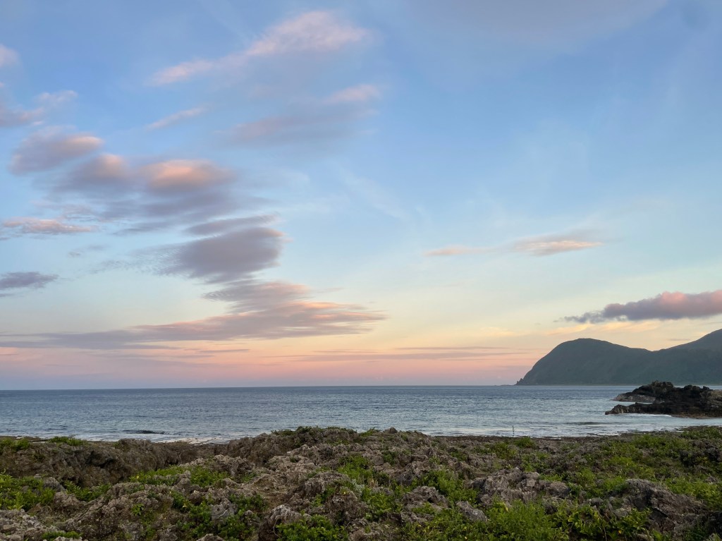 我們在秘境玩到六點,風變得涼涼的,天空漸漸轉為溫柔的粉橘色。蘭嶼的晚霞也美不勝收,像是大自然的畫布,美麗的漸層從淺藍到淺黃再到橘色。
