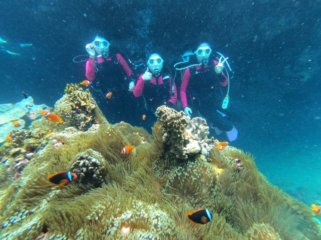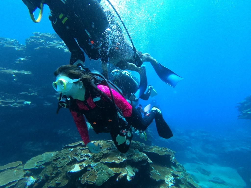 都練習完畢後,教練叫我仰漂在水上。冷面笑匠的教練看我躺得很舒服,還問要不要給我枕頭和棉被 😂 大概躺了約三分鐘後,教練便協助我將身體轉面朝下,正式用嘴巴邊呼吸、身體邊往前游,然後可以感覺到身體就越潛越深,平視的視線看不見海上灑下的陽光,映入眼簾的則是珊瑚礁與繽紛七彩的魚兒。