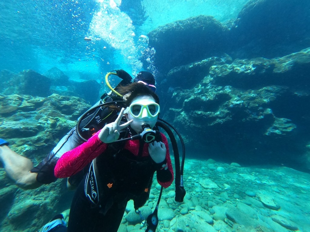 真正開始潛水前,我們先在踩得到地的淺水區練習用嘴巴呼吸。因為有浮潛過所以我知道我做得到,但一開始還是花了點時間讓身體習慣,我必須在空氣中用嘴巴從呼吸管中大吸一口氣,然後把頭潛進水中,用嘴巴吐氣、吸氣、吐氣、吸氣。告訴自己「你可以、不用怕、慢慢來」😂