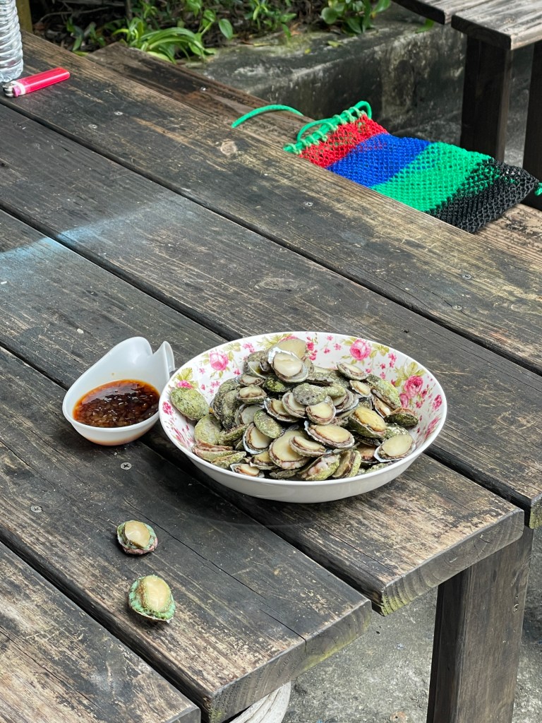 繼續下午的行程之前,我們騎回民宿洗漱更衣。一回到民宿,發現老闆們在享用早上他們去海裡抓的九孔,太酷了!才知道原來新鮮的九孔只要簡單用水川燙後,沾蒜頭醬油就非常美味。由於老闆一直強調「我抓很多,你們趕快吃」,我和旅伴們真的吃了很多XD 太幸福了!