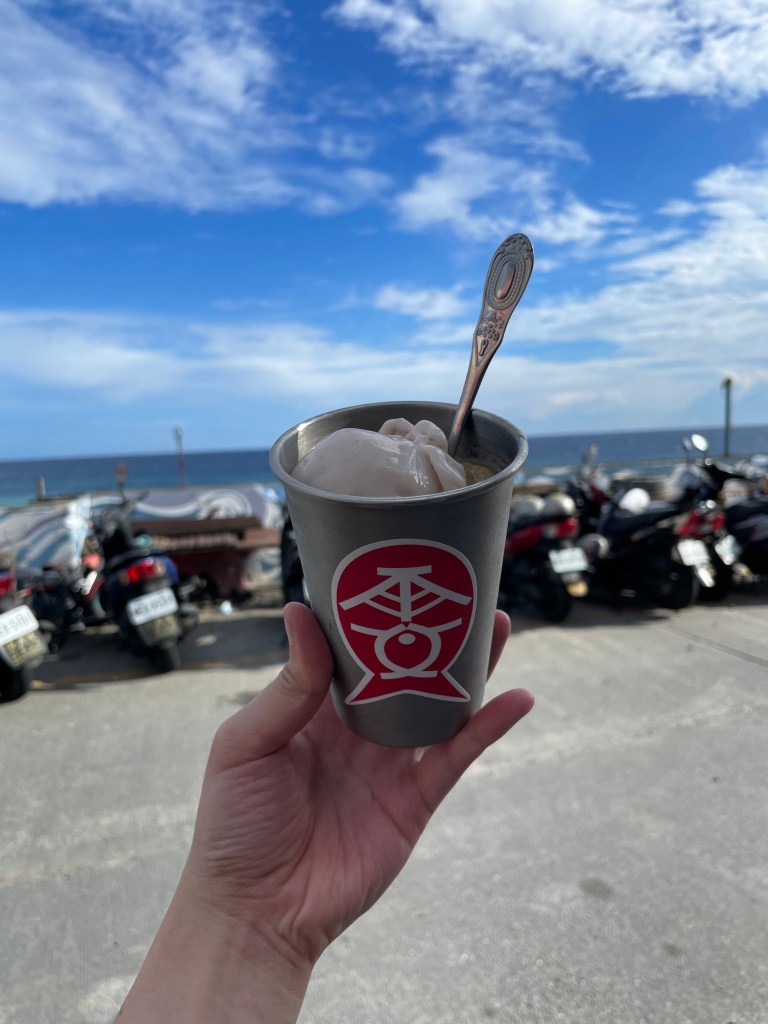 在騎往下一站「雯雯芋頭冰」之前會經過蘭嶼機場與許多民宿,然後當左前方出現一群觀光客卡在某店門外,你就知道雯雯芋頭冰到了。我們都點招牌的「雯雯特調」,內含一球芋頭冰淇淋和焦糖綠豆湯。芋頭冰一如想像的綿密、充滿芋頭味,但好像比東清三十三號的甜一些。湯底的焦糖綠豆湯也頗甜,但能吃到帶著微微燒焦味的焦糖感,還不錯,螞蟻人應該會更愛。
