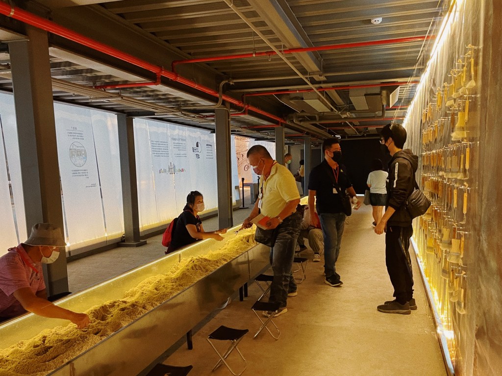第二個則是挖寶藏那區,觀者可以從旁邊的牆面上拿取喜愛的小工具(有小鏟子、小耙子等),然後坐在小椅子上使命地挖,尋找沙堆中的小寶藏。除了有小孩在媽咪的陪伴下好奇的挖,令我意外的是,有許多約五六十歲的阿伯阿姨也很認真參與,那個畫面真是太可愛了!甚至還有阿伯一個人就挖了五六個寶物 😂