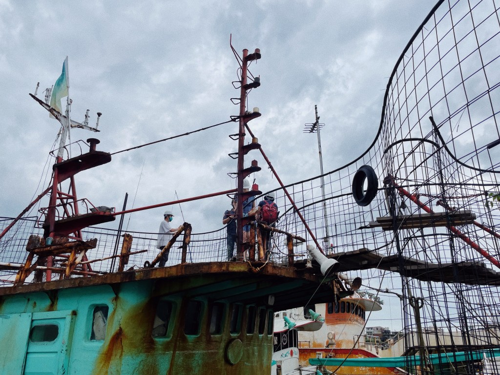 而走到漁會大樓三樓,則會得到一整片的開闊,我也努力用手機,想拍下這座城市如此特別的風情:灰藍色帶點綠色的海、帶著鹹鹹味道的海風。生鏽的建築與漁船,有些斑駁的城市,海上面是船,而船後面是山。我覺得基隆擁有非常堅強的觀光實力,四百年的歷史、15 分鐘就能看遍小山與海港,離大台北這麼近,這樣的先天條件其實很有觀光競爭力。