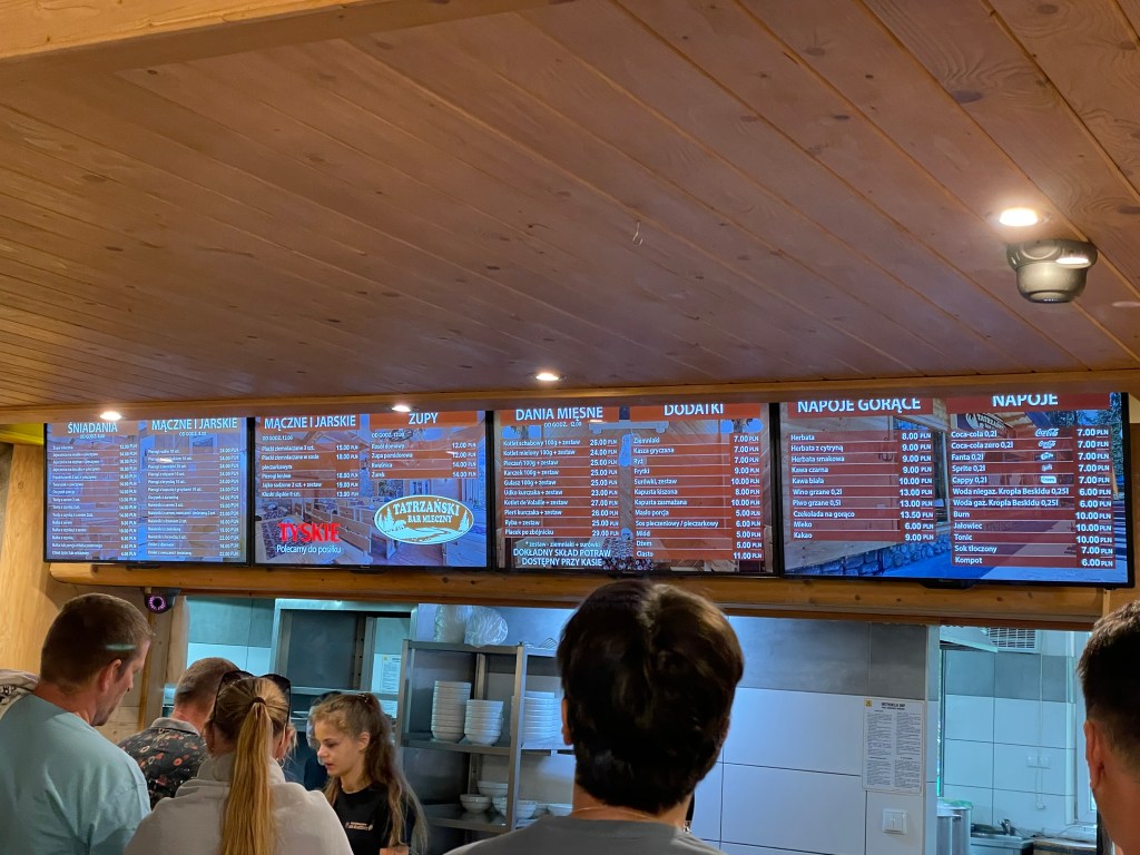 晚上選擇在登山口與 Zakopane 市區中途的一家波蘭 Fast Food 吃晚餐,挑戰我們的第一家波蘭餐廳!進去才發現這個挑戰的確很不容易,因為牆壁上的菜單全是波蘭文 🙃 身為餐廳中唯二亞洲人(or 唯二非波蘭人的人XD)我們邊排隊邊用 Google 翻譯快速查詢菜單的意思,後來用英文加手勢成功點餐。但沒想到,領餐才是最難的一部分XD 餐廳員工會用波蘭語唸號碼,我們完全聽不懂,後來是劉先生等了很久後,對站在旁邊的波蘭夫妻求救,波蘭阿姨也熱心的告訴他餐點來了沒有 😳