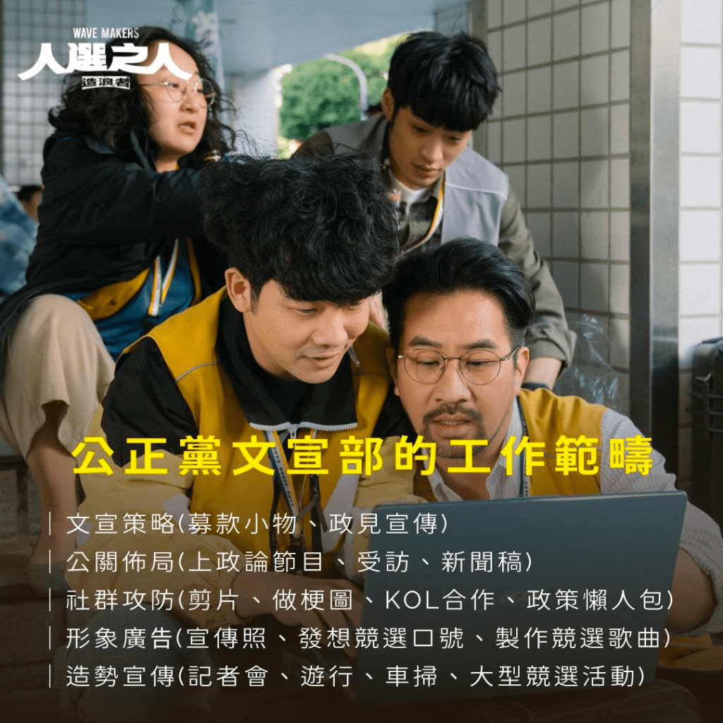 起初看 Netflix 釋出的預告,會以為這是一部角力鬥爭的政治劇,真正開始欣賞後,才發現大錯特錯。《人選之人——造浪者》(以下稱為《人選》)其實是齣以「政治幕僚角色職人劇」包裝的戲劇小品,整個故事線圍繞在由陳家競與翁文芳帶領的公正黨文宣部在總統大選期間為所處政黨付出的努力,也包含周圍人物所發生的日常點滴。