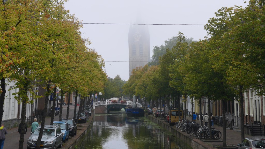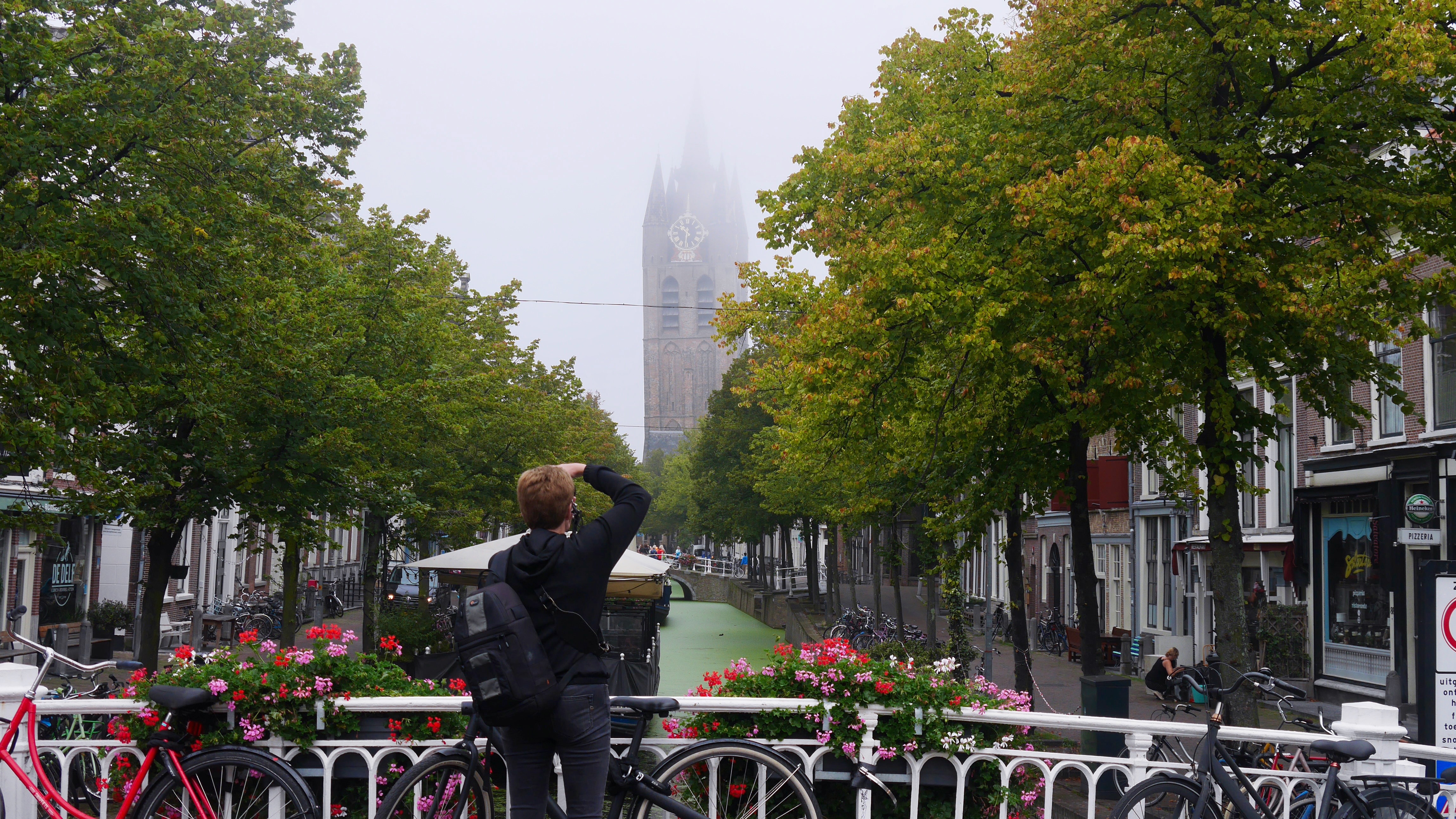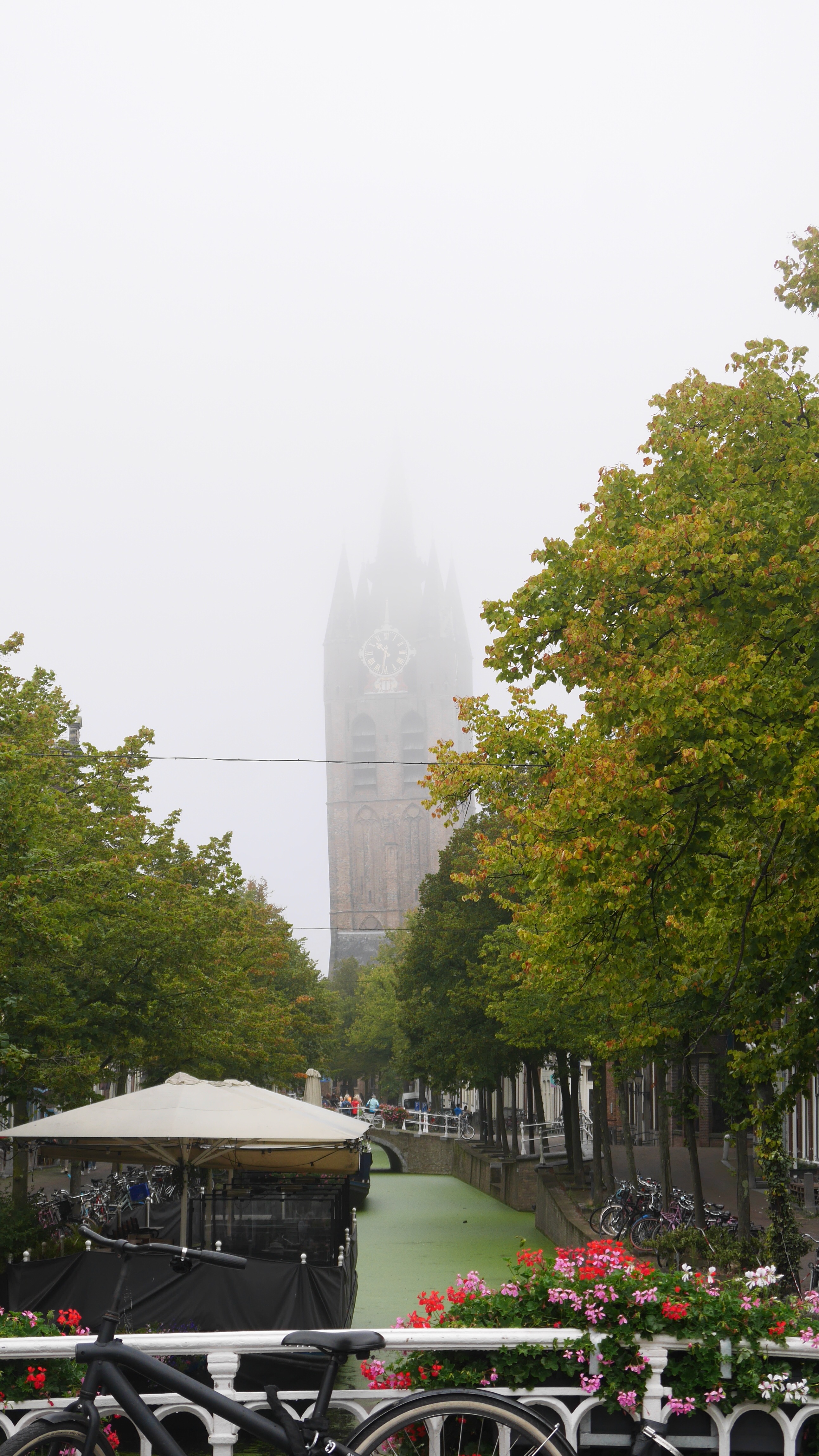 從 Delft 主火車站出來後,走約 5 分鐘,就會來主要的觀光地。只要站在運河邊與小橋上,都能清楚看到舊教堂(Oude Kerk),看照片就知道霧氣有多麽重了。